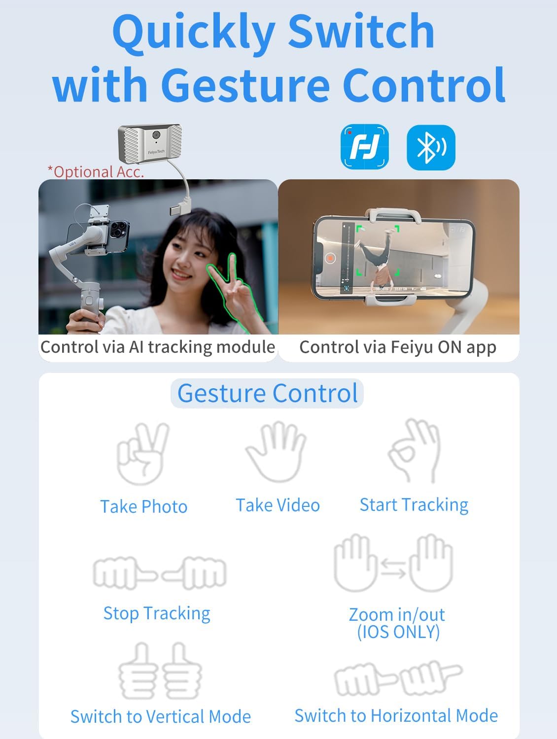 Advanced Shooting Modes: Switch easily between Pan Follow, Tilt Follow, Lock Mode, FPV, and access time-lapse, dolly zoom, light trail, double exposure through the Feiyu ON app (iOS & Android).