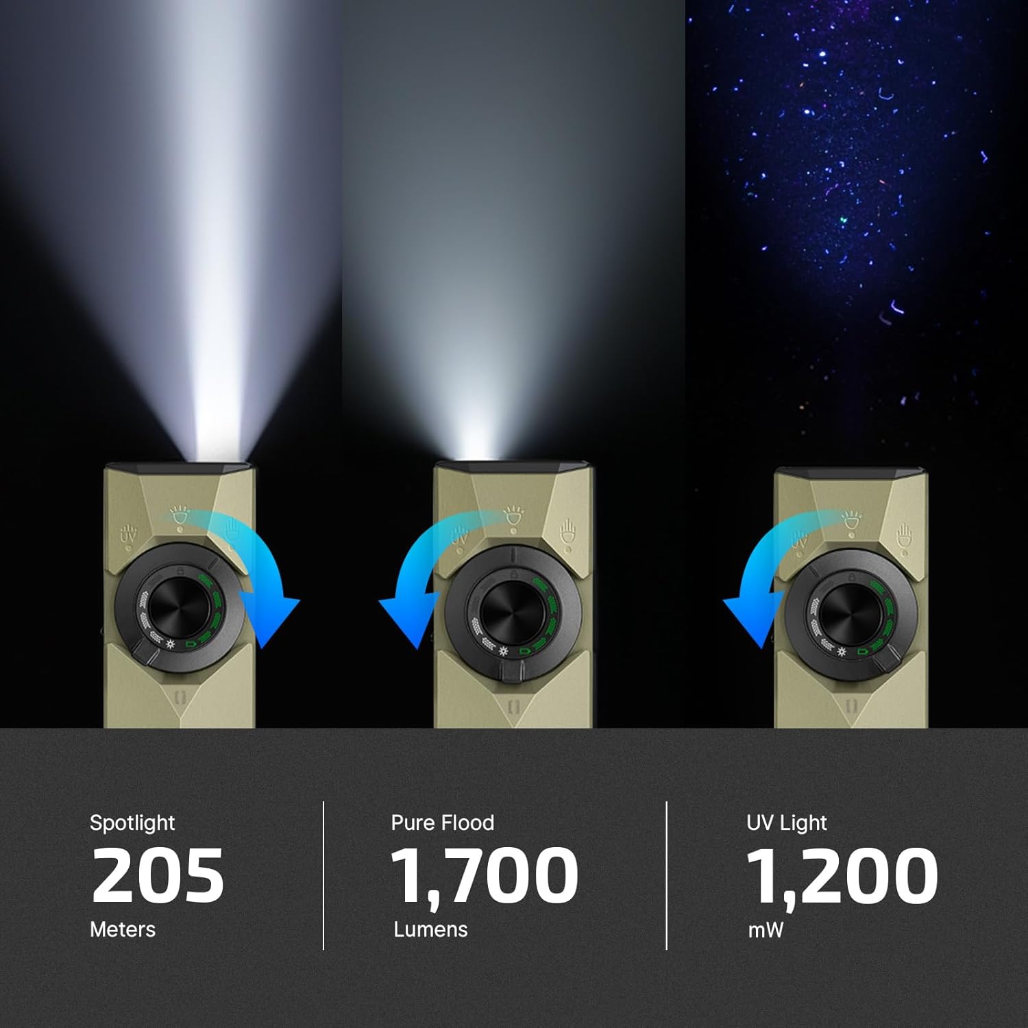 [4 Lights, 7 Configurations] The EDC Flashlight is an upgraded version of Arkfeld Ultra, combining 1700 lumens of Pure Flood, 800 lumens of spotlight, 365nm UV light, and green beam in one flashlight. The Pure Flood offers a wide, soft and seamless beam for everyday use. The spotlight is focused and powerful to see farther and clearer. The UV light features both low and high power modes to reveal stains, detect leaks, and create glowing effects. Four lights can be used separately and the green beam can be used together with any of the 3 light sources to achieve 7 combinations
